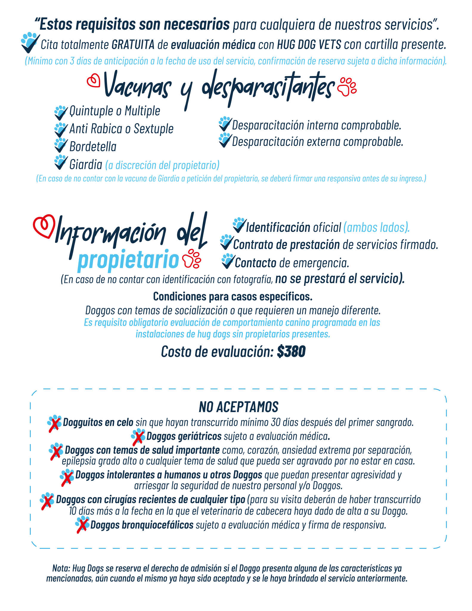 En Hug Dogs es importante la seguridad de nuestros huéspedes y sus humanos. Por lo que a continuación presentamos nuestros requisitos de admisión.